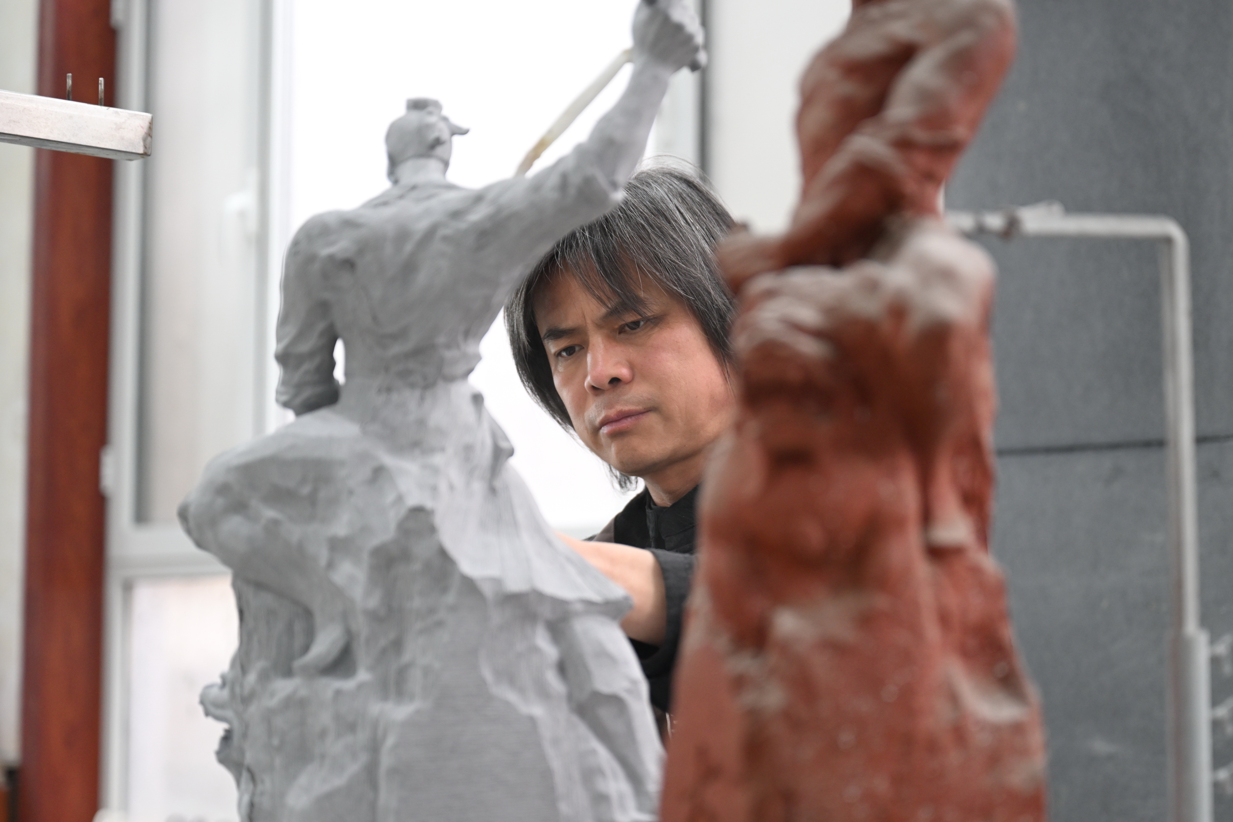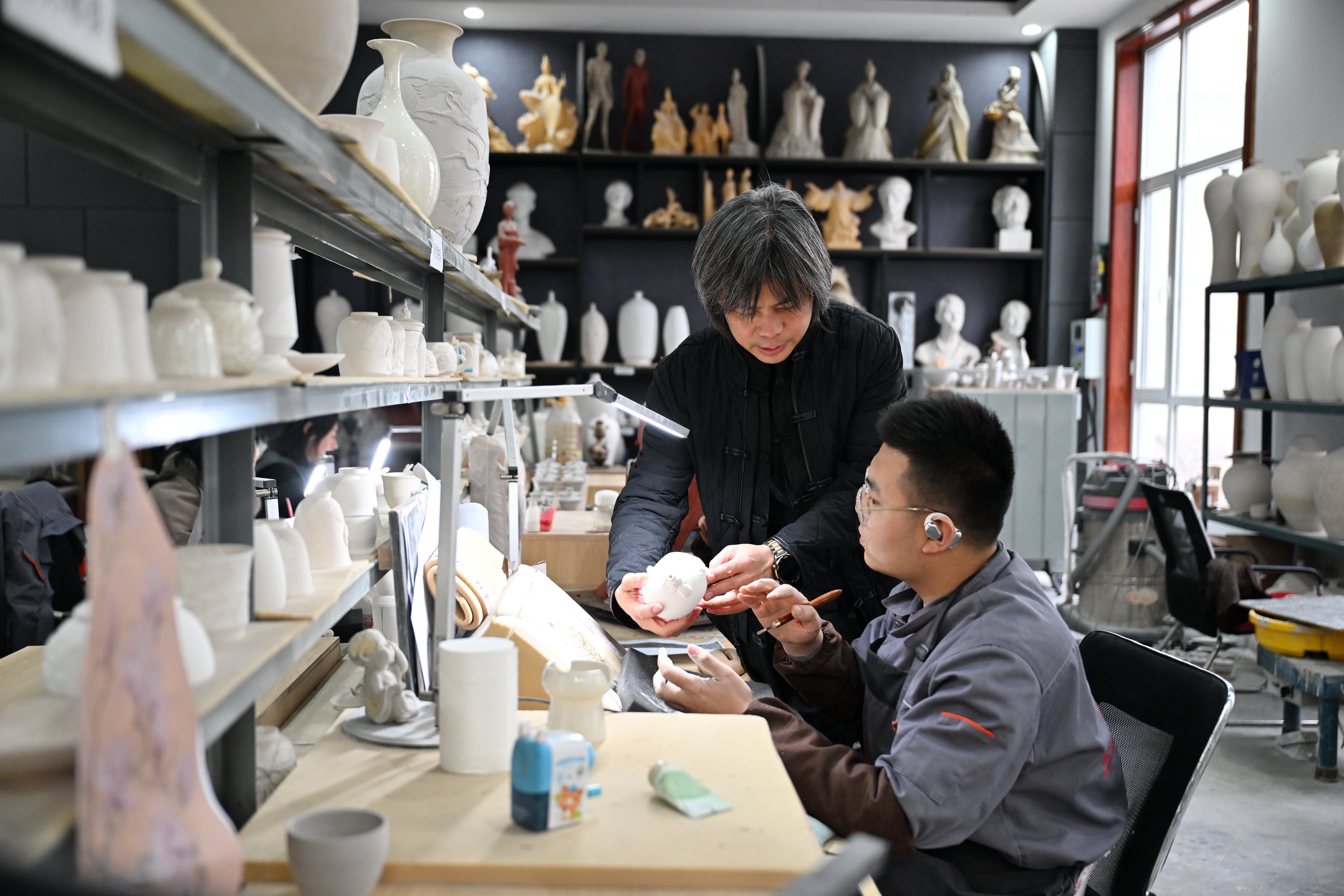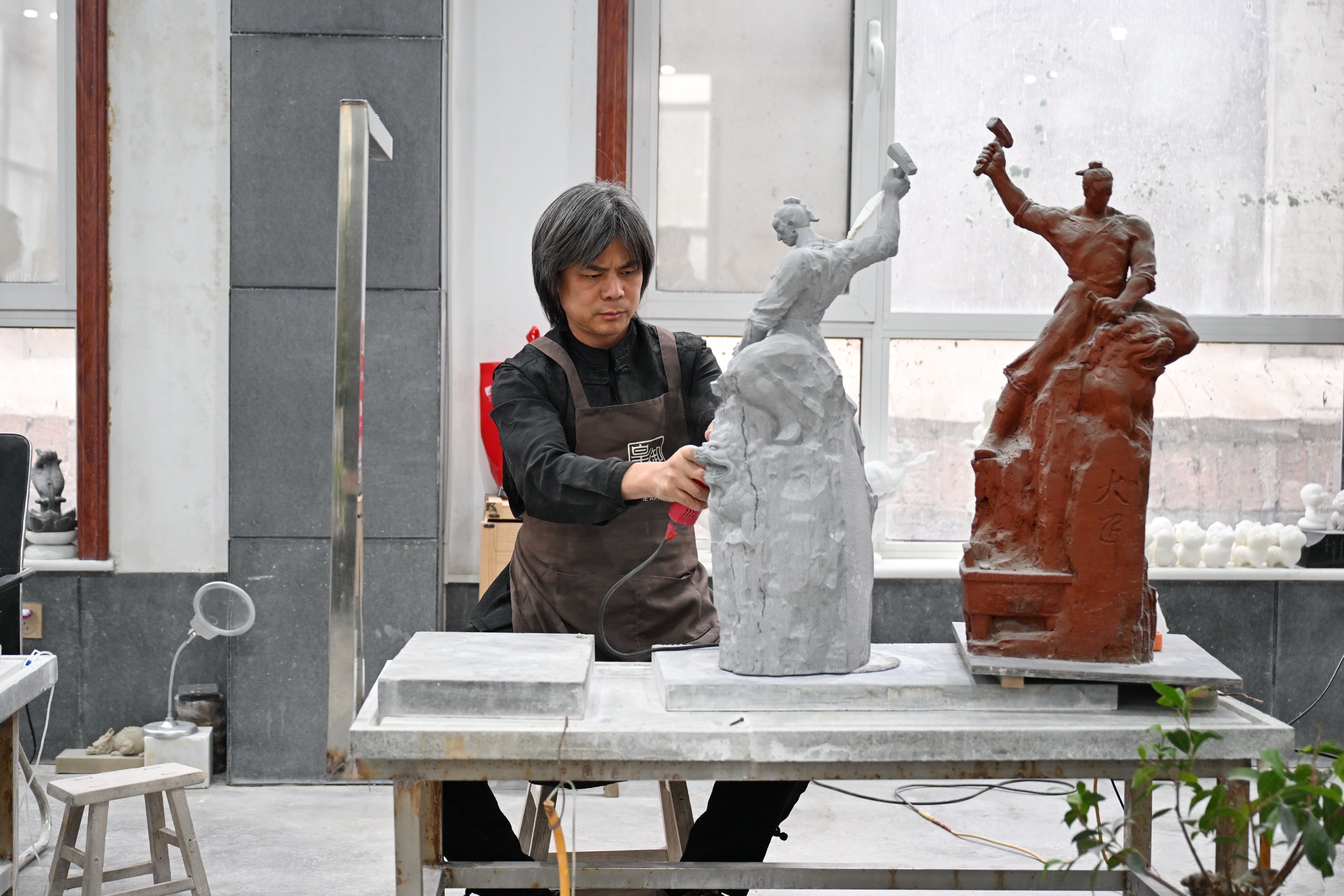 高英坡在工作室进行雕塑创作(2025年2月21日摄)。高英坡的家乡河北省曲阳县是“中国雕刻之乡”,全县有十多万人从事雕刻产业。高英坡十分重视工艺美术的人才培养与技艺传承,他自建了一所艺术馆,不定期讲授雕刻技艺、开展创作培训,努力推动雕刻人才梯队建设。