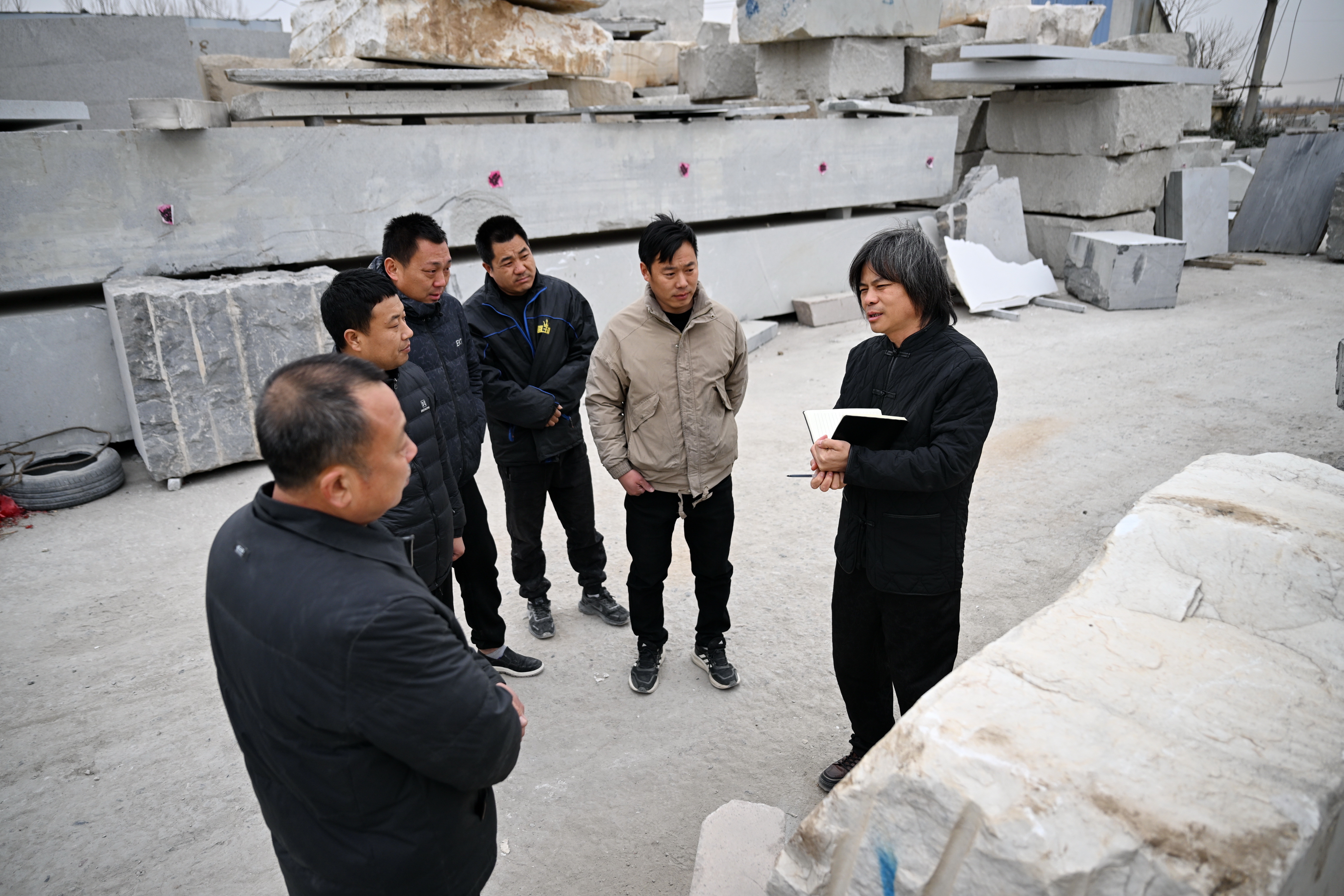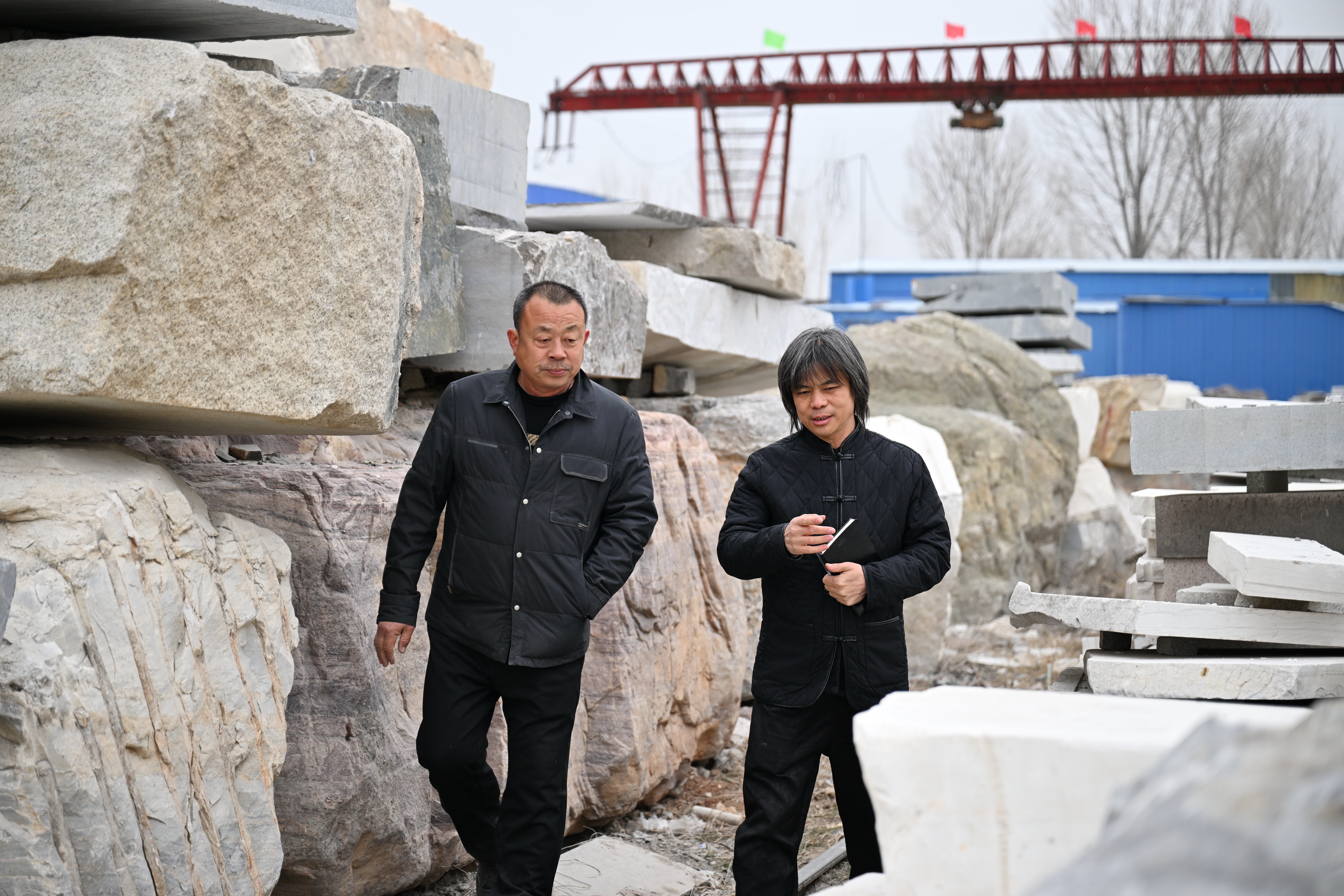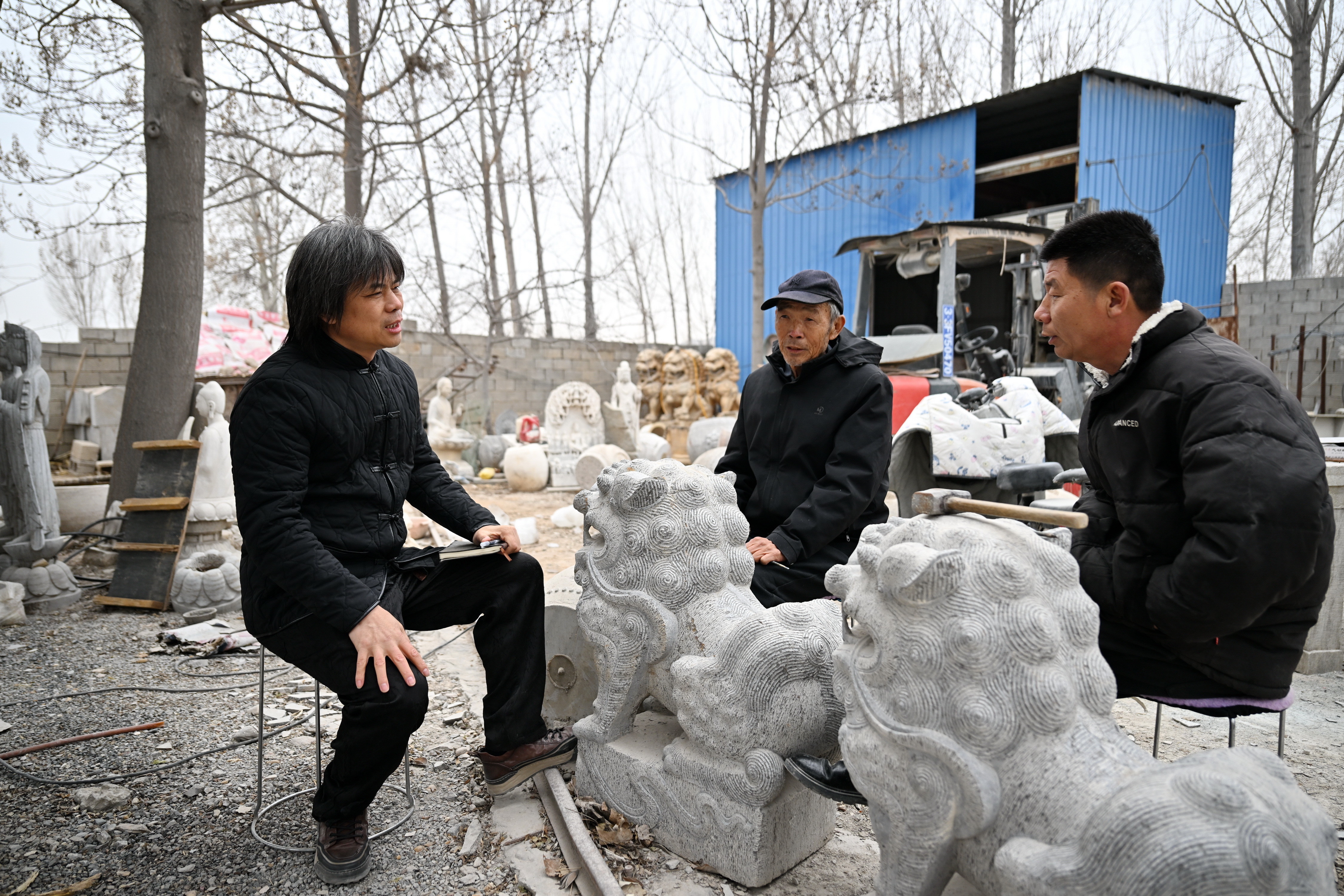高英坡(右一)在河北省曲阳县羊平镇一家园林雕塑企业内调研(2025年2月21日摄)。摄影:牟宇