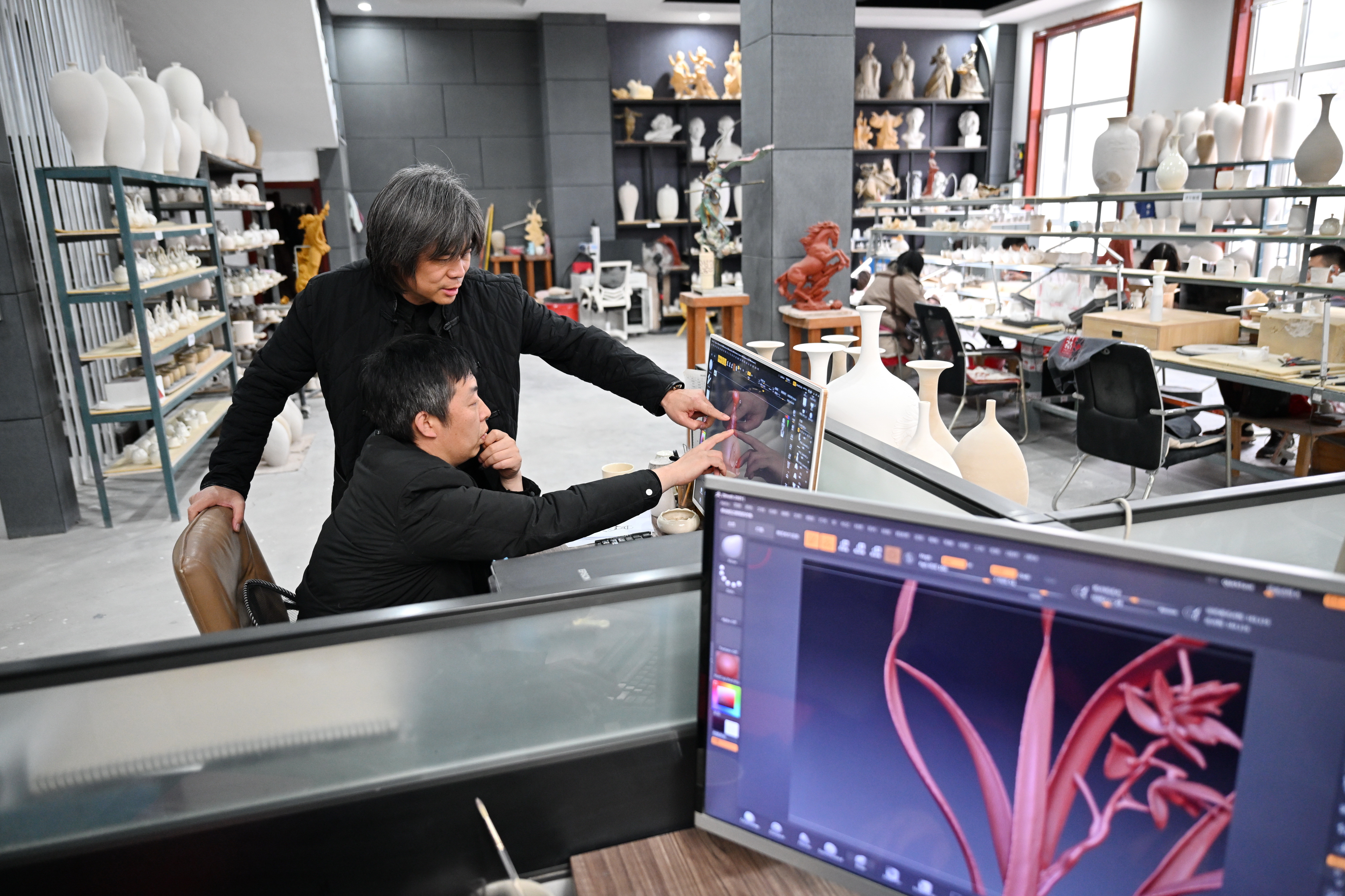 高英坡在工作室与徒弟探讨雕塑设计(2025年2月21日摄)。