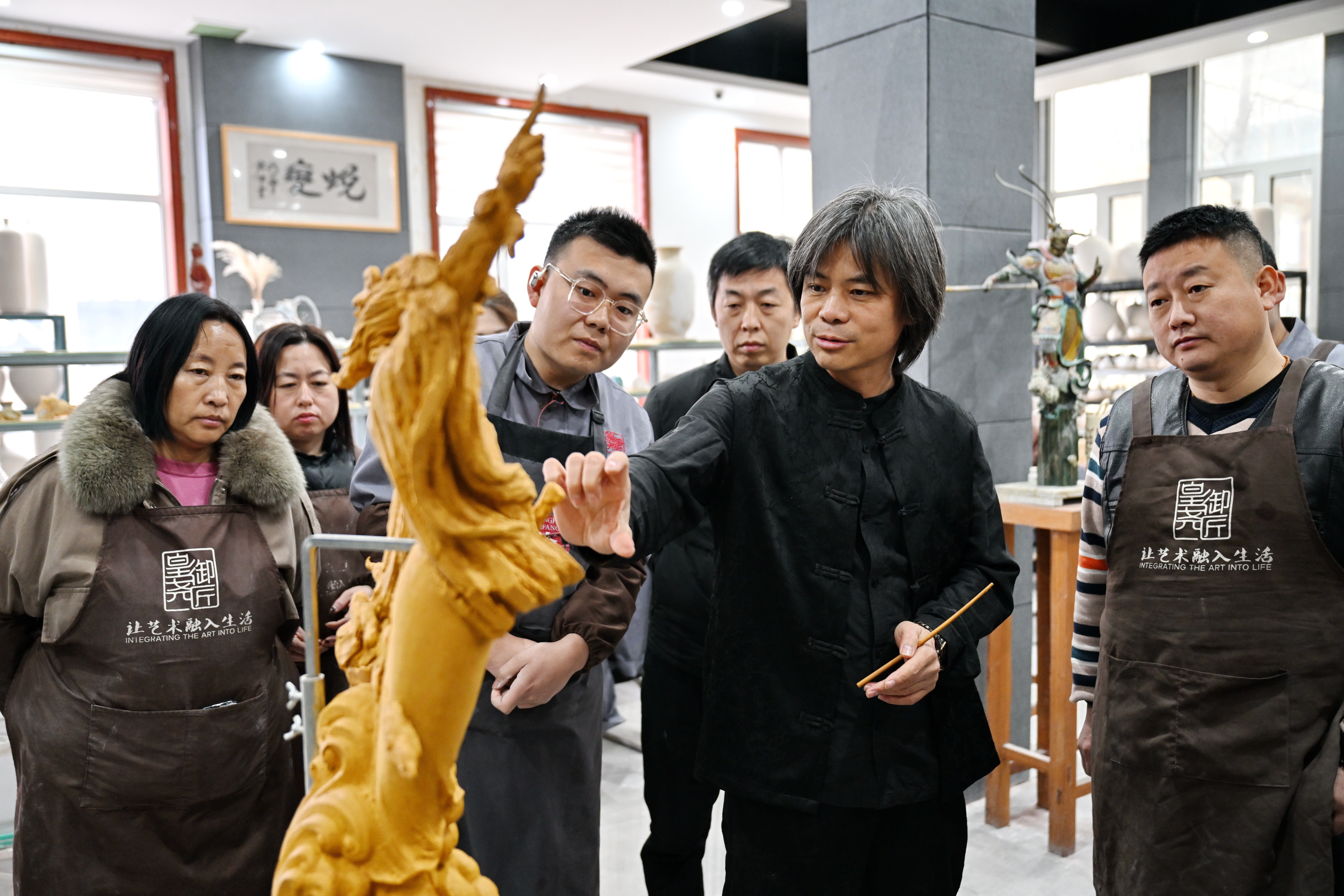 高英坡(右二)在工作室内指导徒弟进行雕塑创作(2025年2月21日摄)。“作为一名全国政协委员,我要利用好每次调研的机会,把大家的建议和需求记录下来,回去好好整理,再对提案进行完善。”高英坡说。2025年全国两会,高英坡将关注工艺美术创新发展及人才队伍建设、县域博物馆建设等议题。
