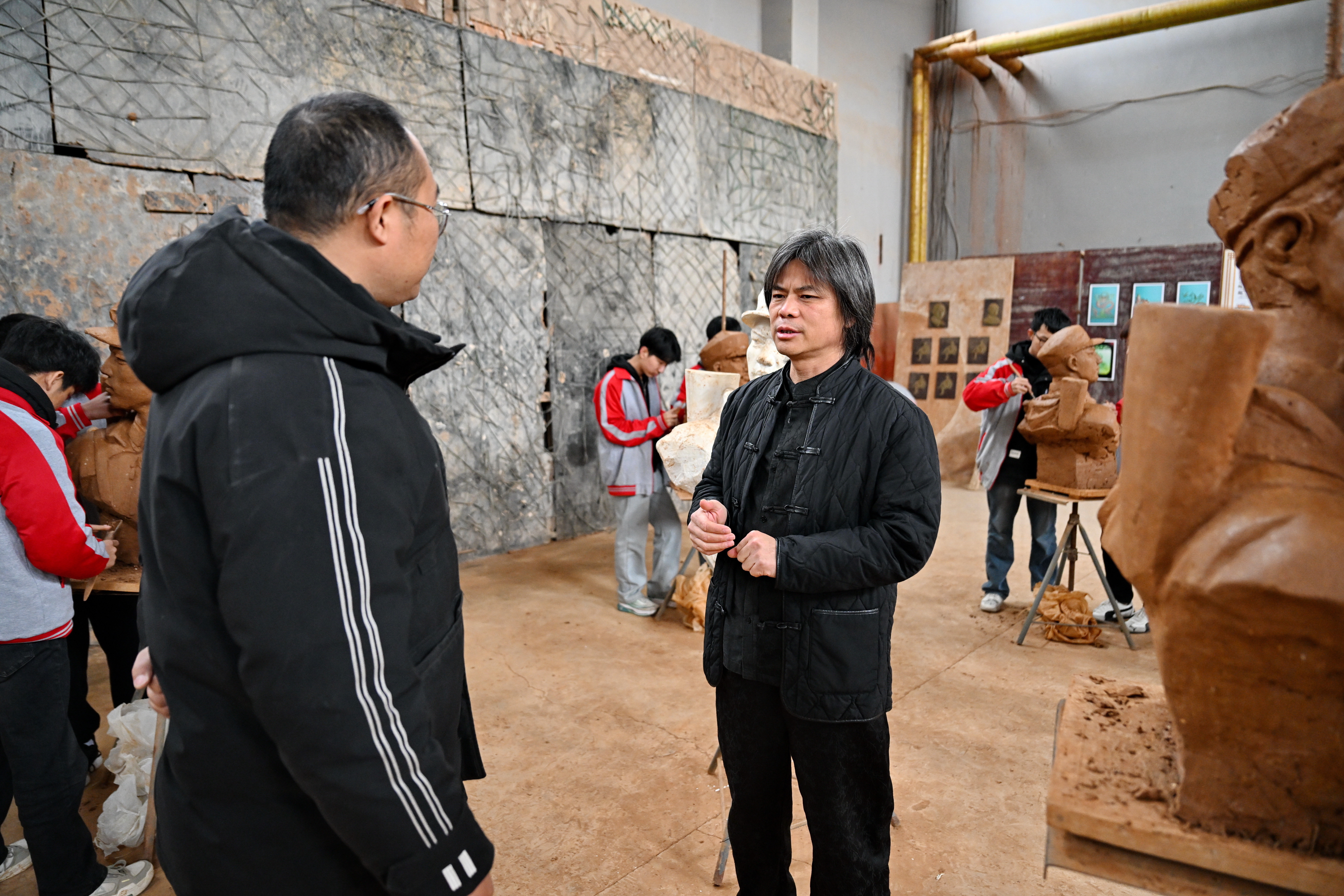 高英坡在河北曲阳雕刻学校与教师交流,了解雕刻人才培养情况(2025年2月21日摄)。